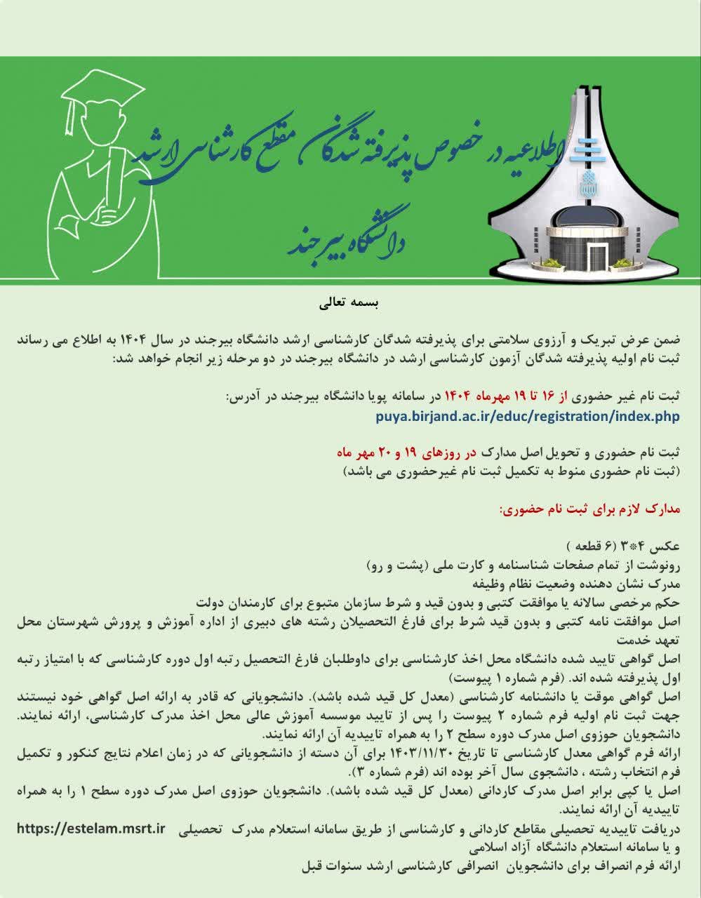 اطلاعیه در خصوص پذیرفته شدگان مقطع کارشناسی ارشد دانشگاه بیرجند ۱۵ مهر ۱۴۰۴ | ۱۳:۰۰ کد : ۳۲۰۲۸ اطلاعیه ها اطلاعیه های مهم ارسال به دیگران نام شما ایمیل شما ایمیل دریافتکننده ارسال انصراف تعداد بازدید:۳۱۷ ضمن تبریک به پذیرفته شدگان کارشناسی ارشد دانشگاه بیرجند در سال ۱۴۰۴ برای اطلاع از فرایند ثبت نام تصویر را مطالعه فرمایید.