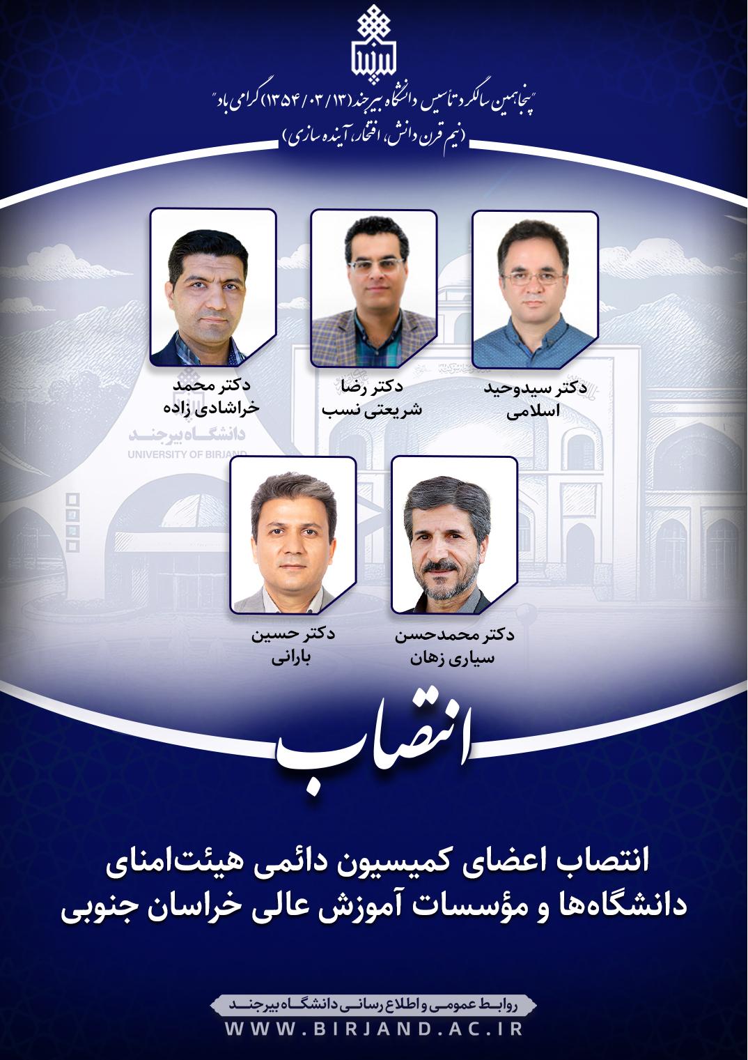 به گزارش روابط عمومی و اطلاع‌رسانی دانشگاه بیرجند، احکام جداگانه‌ای از سوی دکتر علی خاکی صدیق، رئیس مرکز هیئت‌های امنا و هیئت‌های ممیزه،دکتر سید وحید اسلامی، دکتر حسین بارانی، دکتر محمد خراشادیزاده، دکتر محمدحسن سیاری زهان و دکتر رضا شریعتی نسب به عنوان اعضای کمیسیون دائمی هیئت امنای دانشگاه‌ها و مؤسسات آموزش عالی خراسان جنوبی منصوب شدند.