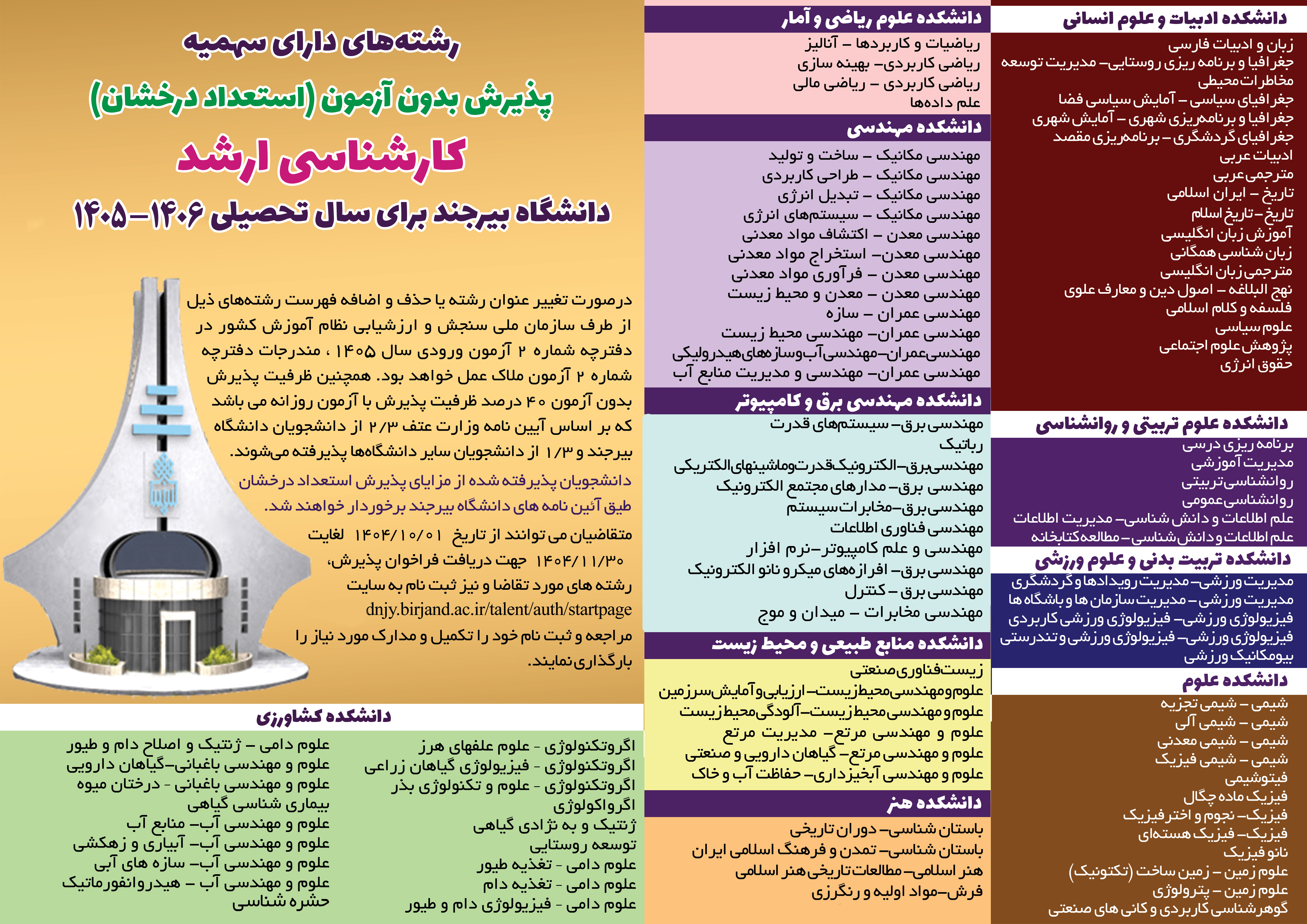 اعلام رشته‌های دارای ظرفیت پذیرش استعدادهای درخشان مقاطع کارشناسی ارشد و دکتری دانشگاه بیرجند برای سال تحصیلی 1405-1406