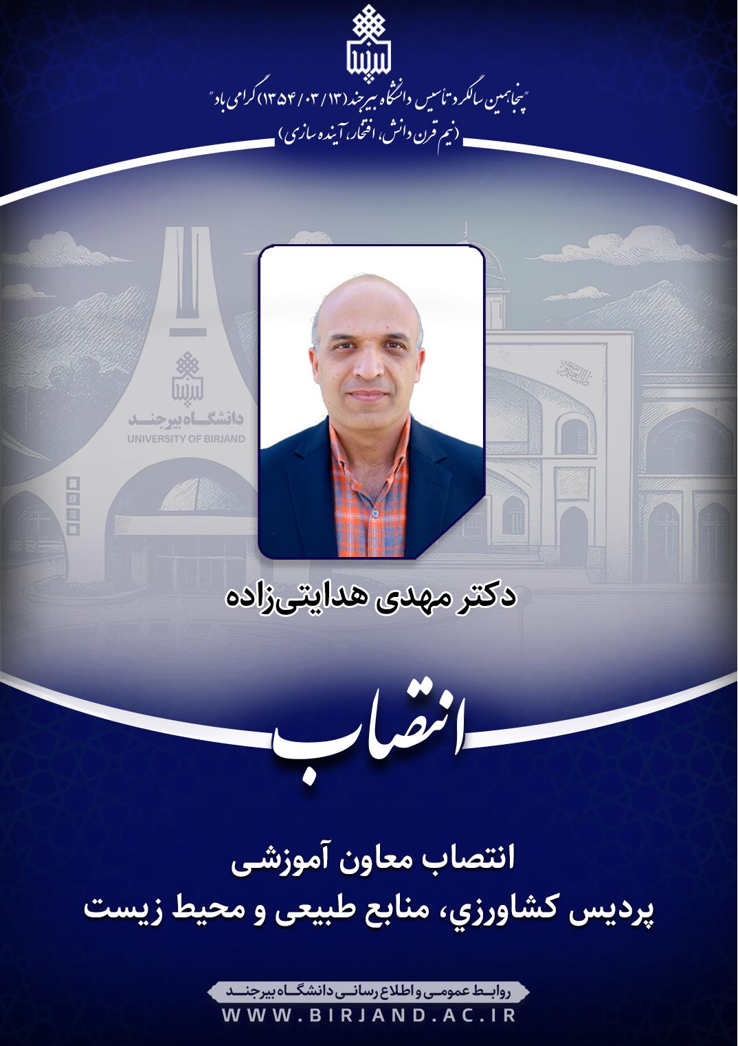دکتر احمد خامسان، سرپرست دانشگاه بیرجند، طی ابلاغی، دکتر مهدی هدایتی‌زاده، عضو هیأت علمی گروه آموزشی مهندسی تولید و ژنتیک گیاهی را به سمت معاون آموزشی پردیس کشاورزی، منابع طبیعی و محیط زیست به مـدت دو سال منصوب کرد.