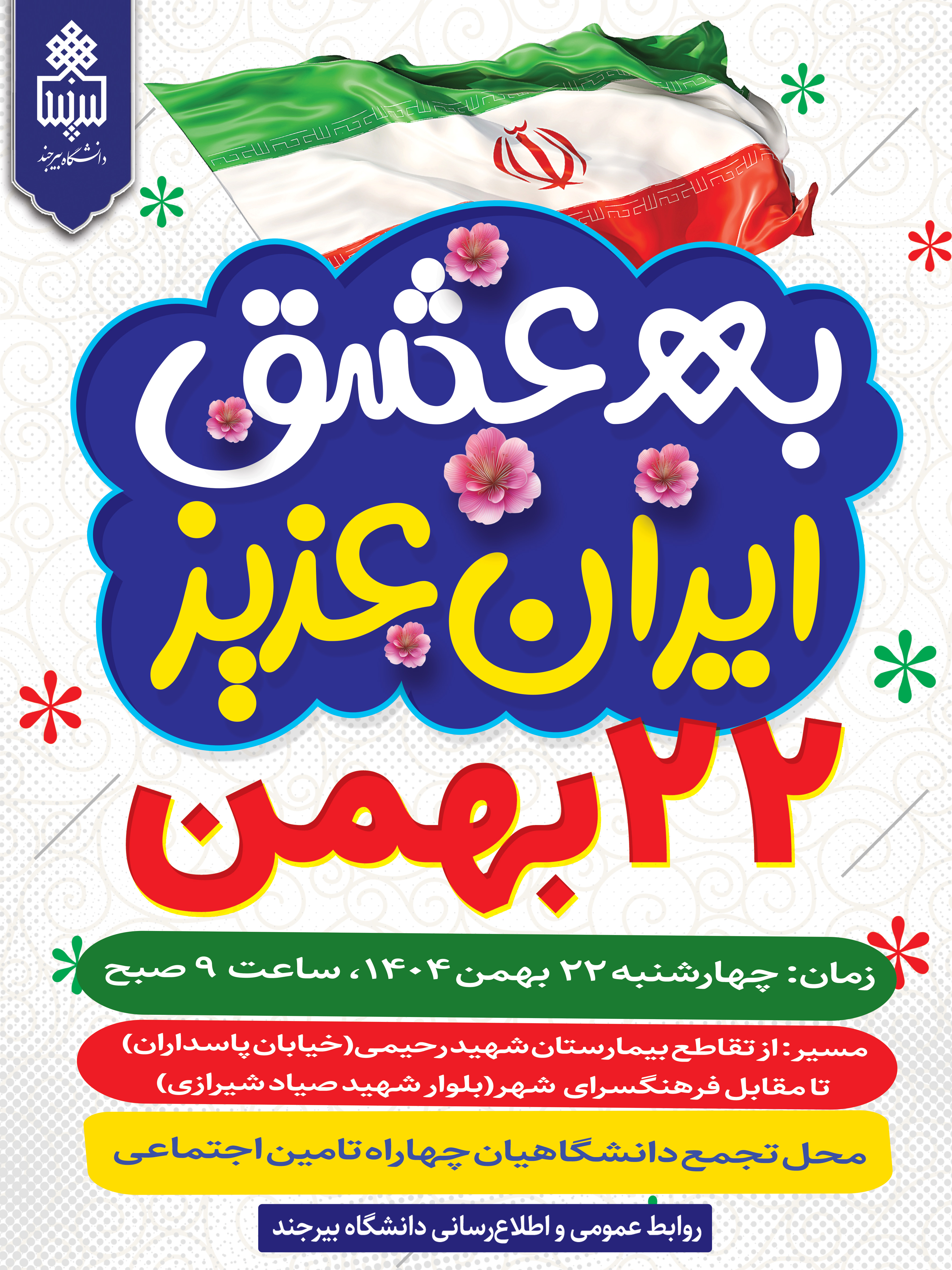 به مناسبت فرارسیدن سالروز پیروزی شکوهمند انقلاب اسلامی، از دانشجویان، اساتید، کارکنان و دانشگاهیان گرامی دعوت بهعمل میآید با حضور پرشور و آگاهانه خود در راهپیمایی یومالله ۲۲ بهمن، بار دیگر با آرمانهای والای انقلاب اسلامی و امام راحل (ره) تجدید میثاق نمایند.