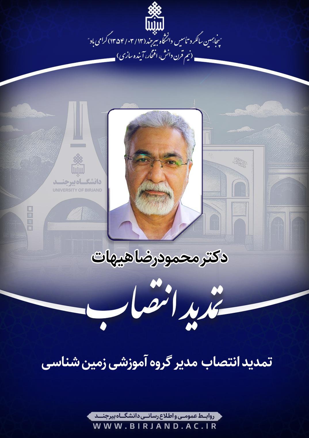 به موجب ابلاغی از سوی دکتر احمد خامسان، سرپرست دانشگاه بیرجند، با تمدید انتصاب دکتر محمودرضا هیهات، عضو هیأت علمی گروه آموزشی زمین شناسی، در سمت مدیر گروه آموزشی زمین شناسی، به مدت دو سال موافقت شد.